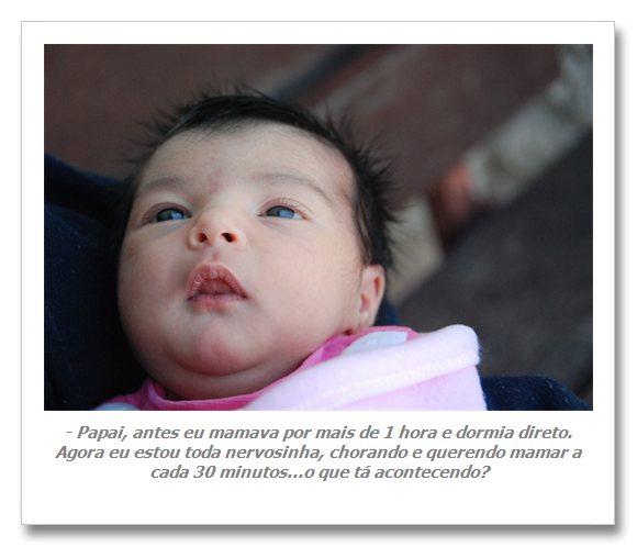 O bebê que em geral é calminho, não chora muito, nem dá trabalho de repente fica nervoso, chora sem parar por horas a fio com altos berros e quer mamar constantemente numa fome que parece incontrolável. Isso é chamado de "Growth Spurt", algo que é comparado a grosso modo com espécie de "puberdade" do nenêm.